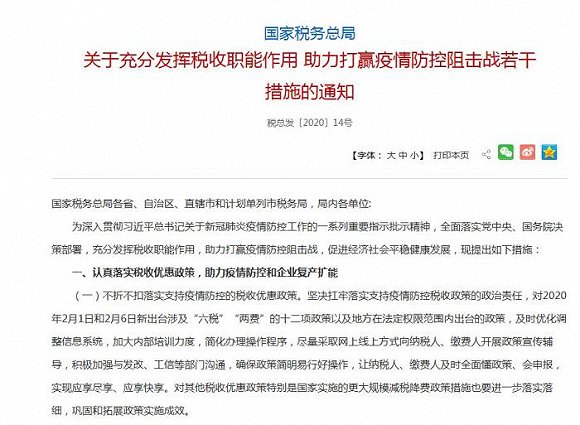 10日,国家税务总局出台18条措施,助力打赢疫情防控阻击战。依法延长申报纳税期限。在延长2月份申报纳税期限的基础上,对受疫情影响办理申报仍有困难的纳税人,可依法申请进一步延期。对受疫情影响逾期申报或逾期报送相关资料的纳税人,免予行政处罚,相关记录不纳入纳税信用评价;对逾期未申报的纳税人,暂不按现行规定认定非正常户。