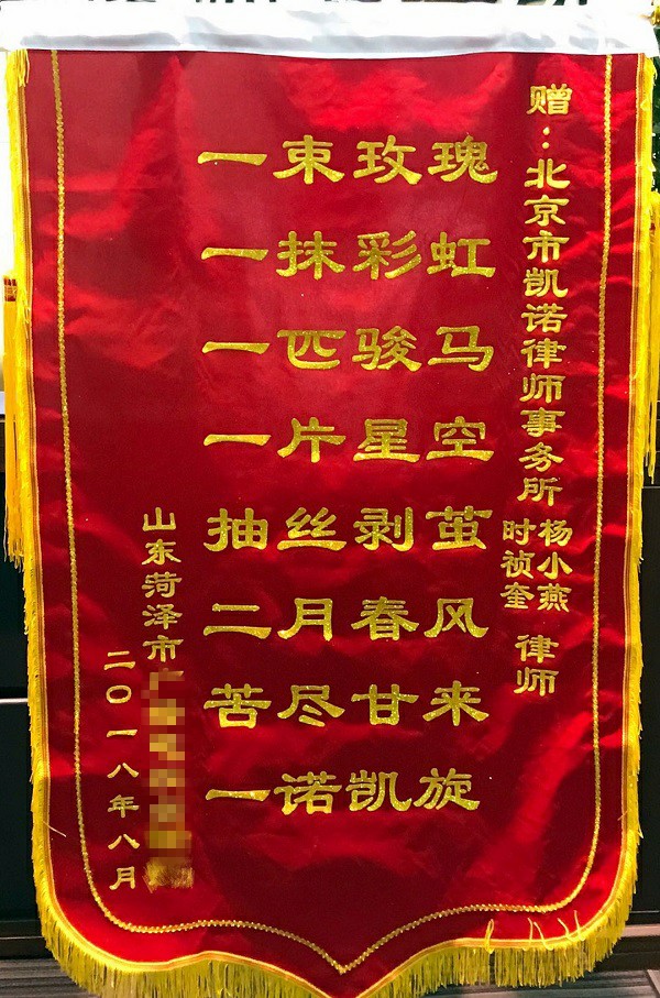 “一束玫瑰,一抹彩虹,一匹骏马,一片星空。抽丝剥茧,二月春风,苦尽甘来,一诺凯旋。”2018年9月6日,北京凯诺拆迁律师团时祯奎、杨小燕两位律师收到来自山东省菏泽市当事人的致谢荣誉锦旗。锦旗的字里行间都表达了当事人对凯诺所两位律师的高度评价和肯定,同时也表达了对两位律师的万分感谢。