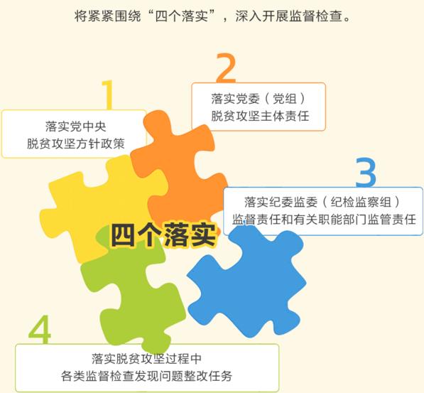 根据中央纪委国家监委网站上介绍,本轮巡视将对被巡视党组织落实脱贫攻坚政治责任进行监督和督促,将紧紧围绕“四个落实”,深入开展监督检查。
