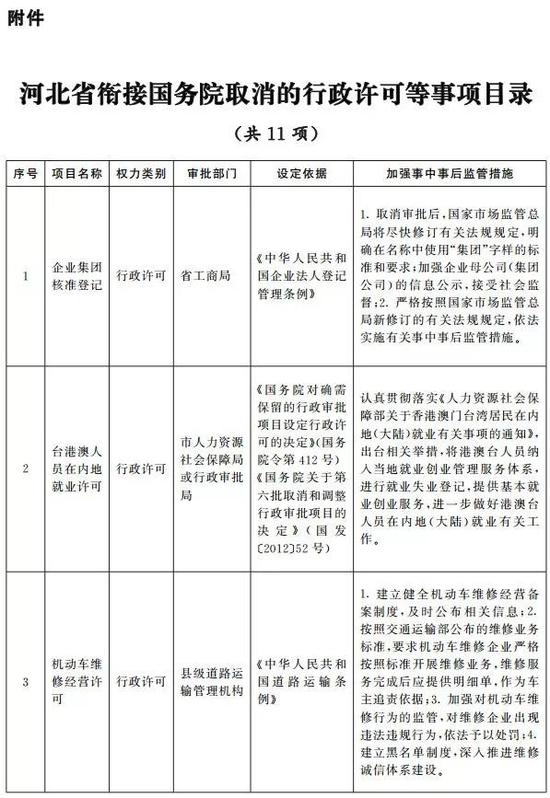 日前,河北省政府办公厅发布了《河北省人民政府办公厅关于衔接落实国务院取消一批行政许可等事项的通知》“通知”明确对国务院取消的11项行政许可等事项,河北省全部予以落实取消。